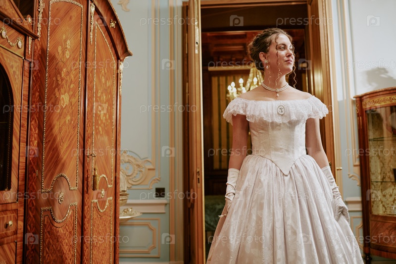 Молодая взрослая женщина, одетая в элегантное платье, стоит внутри