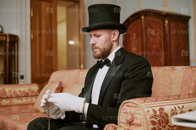 Мужчина среднего возраста, носящий смокинг, сидящий в помещении и держащий карманные часы