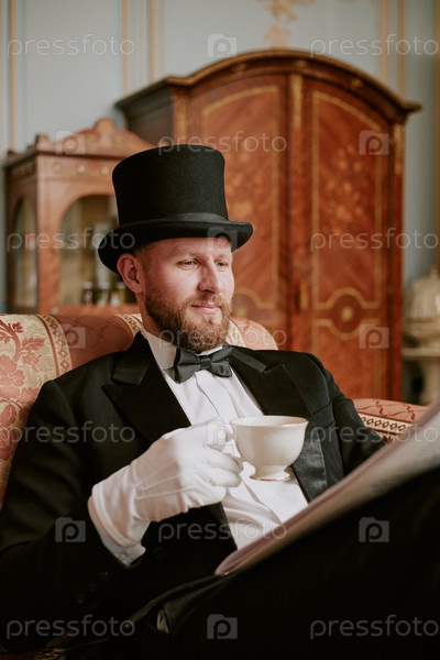 Молодой взрослый мужчина отдыхает в помещении, пьёт чай и читает газету