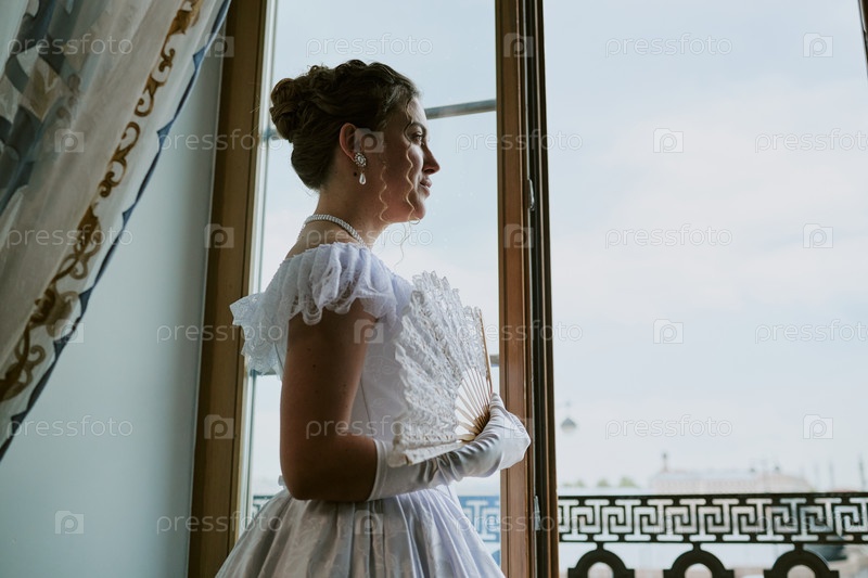 Молодая взрослая женщина стоит у окна, держа декоративный вентилятор внутри