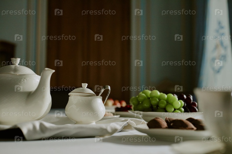 Керамический чайник и виноград расположены на столе во время элегантного сбора завтрака