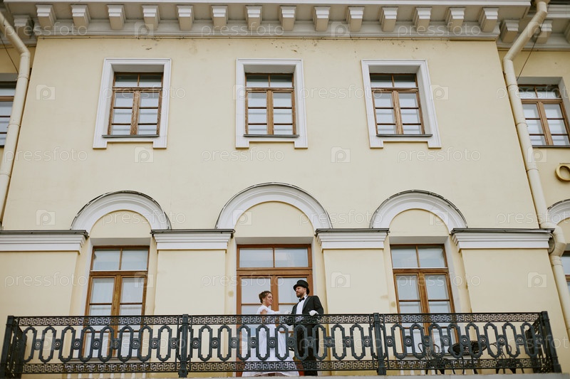 Молодые невеста и жених стоят на балконе за пределами исторического здания