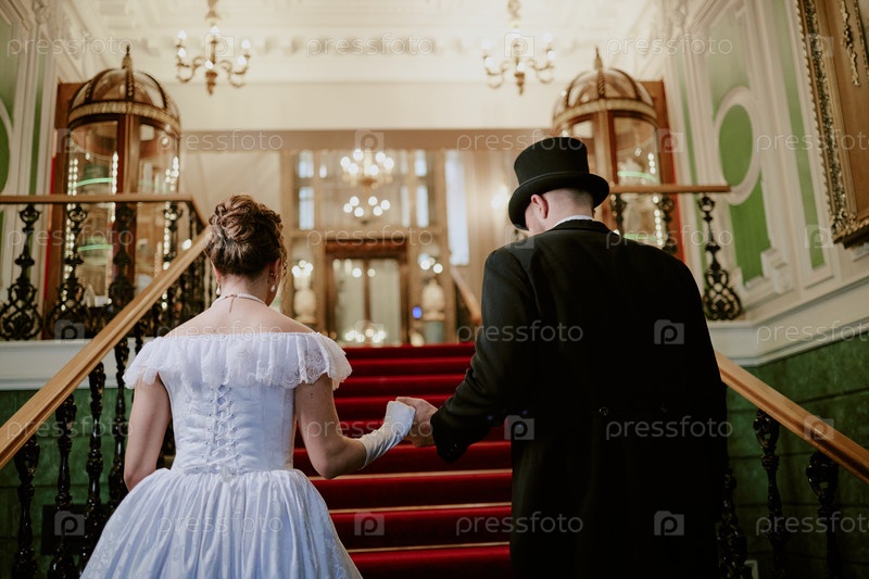 Молодая женщина и молодой человек вместе поднимаются по большой лестнице