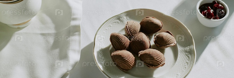 Заголовок изображения шоколадной раковины печенье на тарелке рядом со Bowl of Cherries