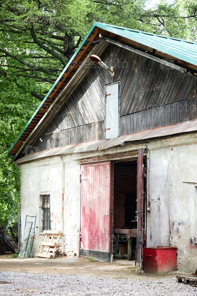 Старый сельский амбар, стоящий на солнечном свете с открытой дверью и вытянутым наружным покрытием