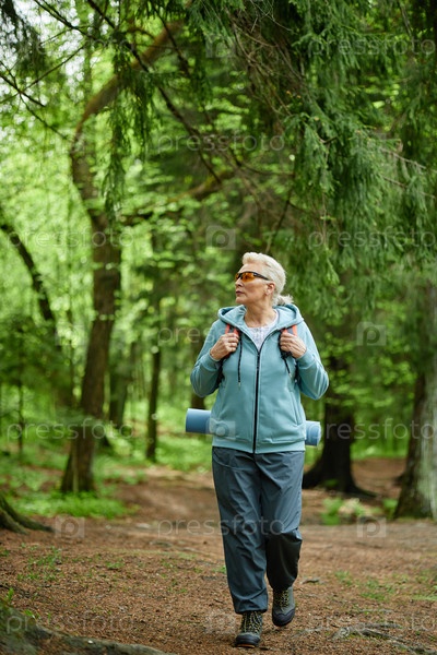 Пожилая женщина, путешествующая по лесу с матом для йоги и рюкзаком