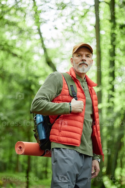 Пожилой мужчина, путешествующий по лесу с рюкзаком и матом для йоги