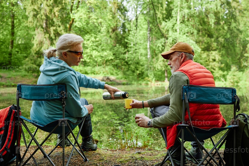 Старшая женщина наливает мужчине горячий напиток на открытом воздухе