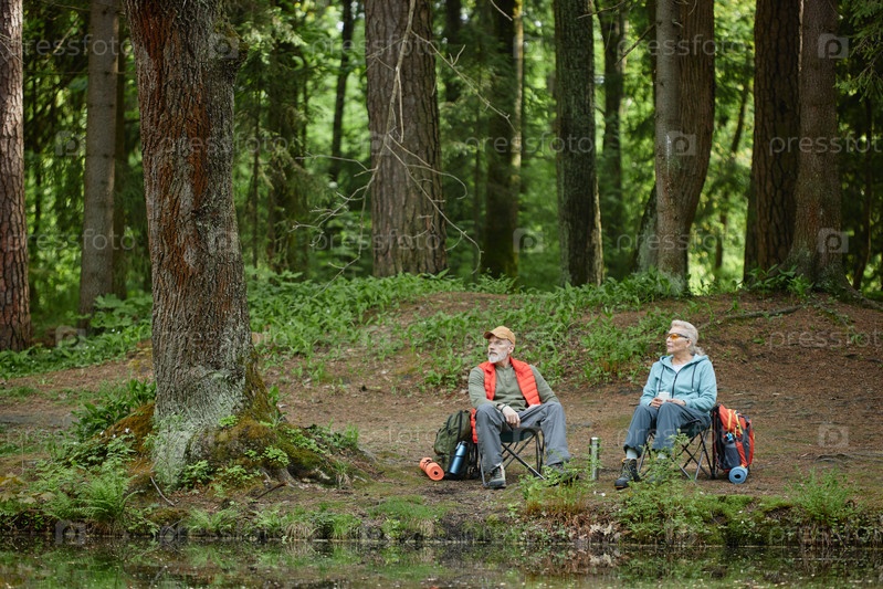 Мужчина и женщина сидят на улице, отдыхают в лесу возле озера Senior