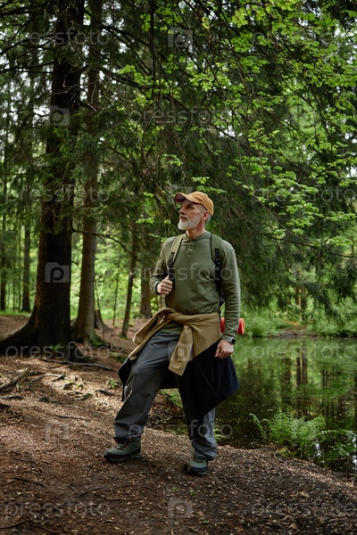 Старший мужчина походы в лесу возле озера наслаждаясь природой и приключениями