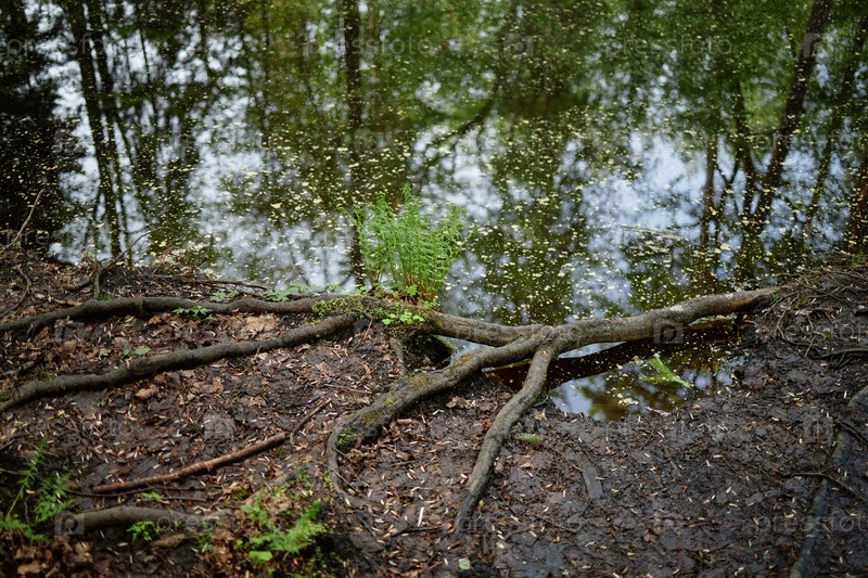 Корни, простирающиеся к поверхности воды в лесу отражаются на пруду