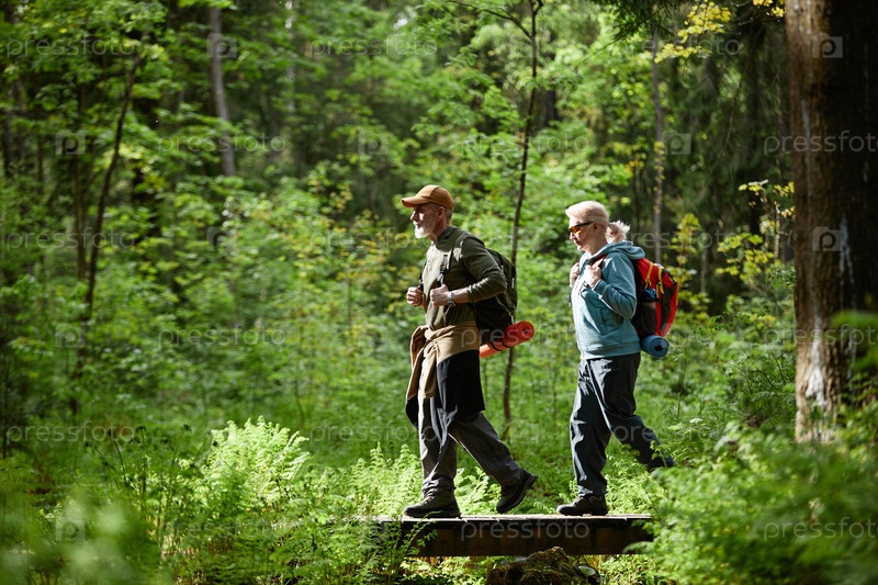 Пожилые люди вместе ходят в лес во время приключений на открытом воздухе