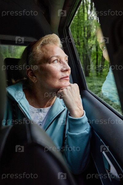 Старшая женщина смотрит в окно машины, отражая природные пейзажи