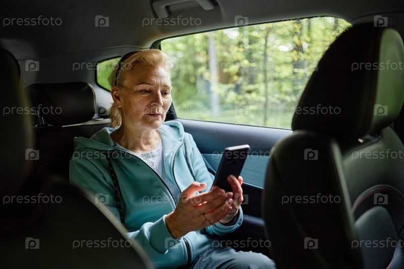Пожилая женщина сидит в машине, используя смартфон для общения