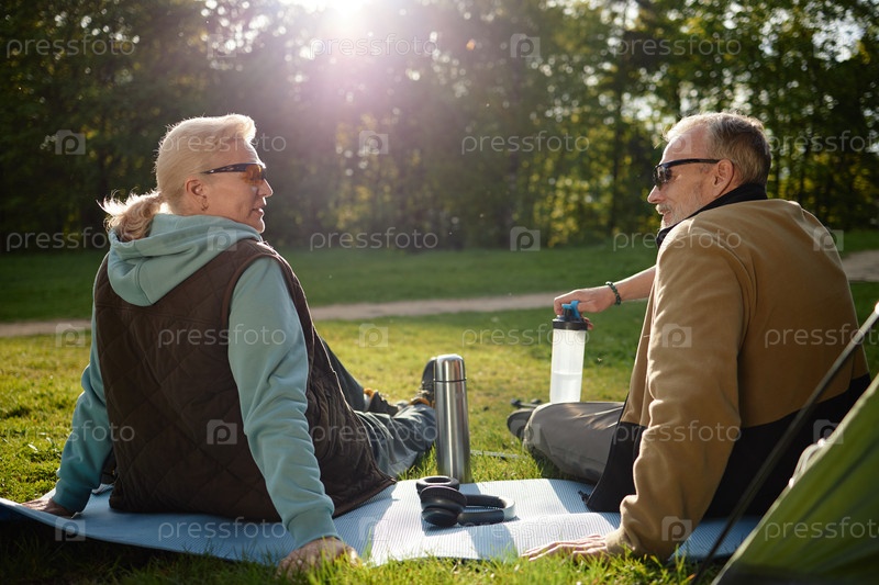 Старшая пара отдыхает на свежем воздухе и разговаривает во время похода в кемпинг
