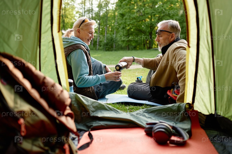 Старшая пара сидит на свежем воздухе, делясь горячим напитком во время кемпинга
