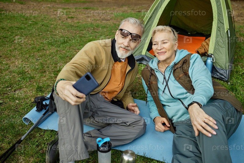 Старшая пара отдыхает на свежем воздухе, делая селфи возле кемпинговой палатки