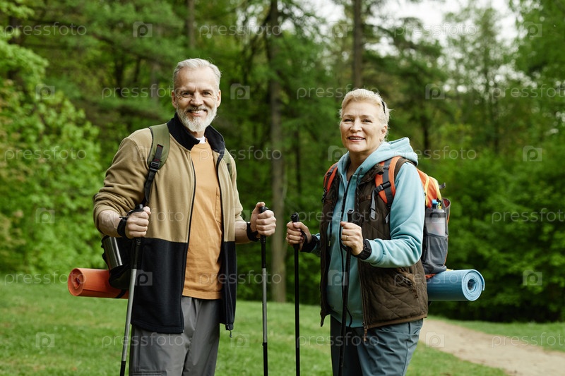Пожилой мужчина и женщина вместе ходят в лес и улыбаются на открытом воздухе