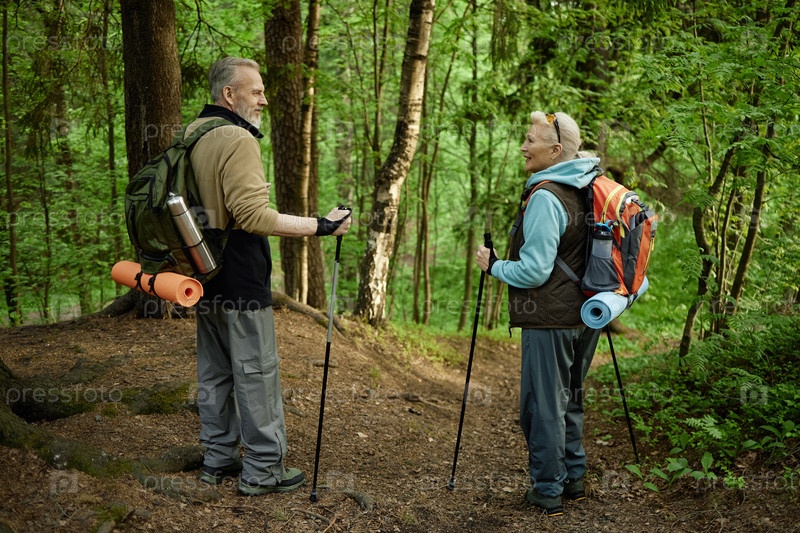 Старшая пара вместе ходит в лес и улыбается друг другу