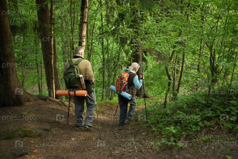 Мужчина и женщина-старший ходят с рюкзаками по лесной тропе