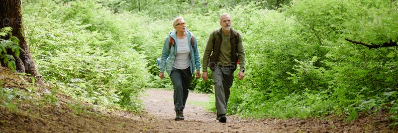 Старшая пара вместе гуляет по лесной тропе, наслаждаясь природой