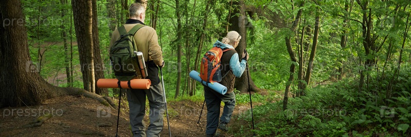 Старший мужчина и женщина ходят с рюкзаками по лесной тропе