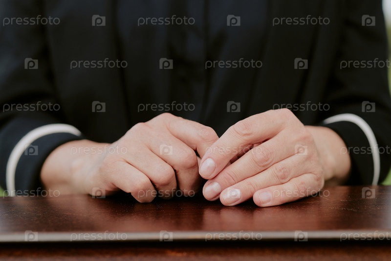 Пожилая женщина складывает руки на гробу на похоронах