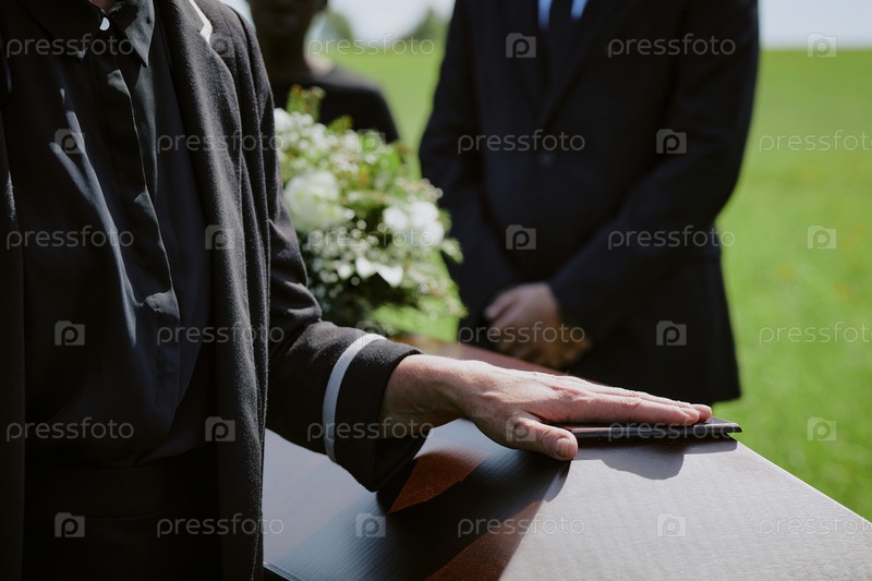 Женщина среднего возраста скорбит рядом с гробом во время похоронной церемонии