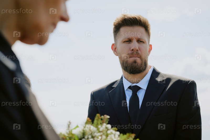 Молодой взрослый мужчина скорбит во время похоронной церемонии на открытом воздухе