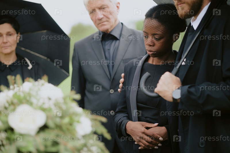 Молодая чернокожая женщина, которую утешает различная группа скорбящих на похоронах