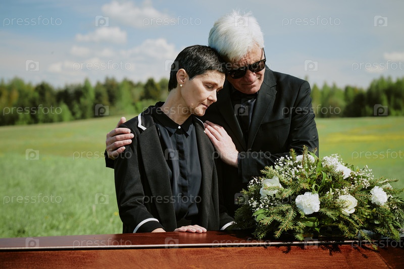 Женщина средних лет и пожилой мужчина скорбят на похоронах