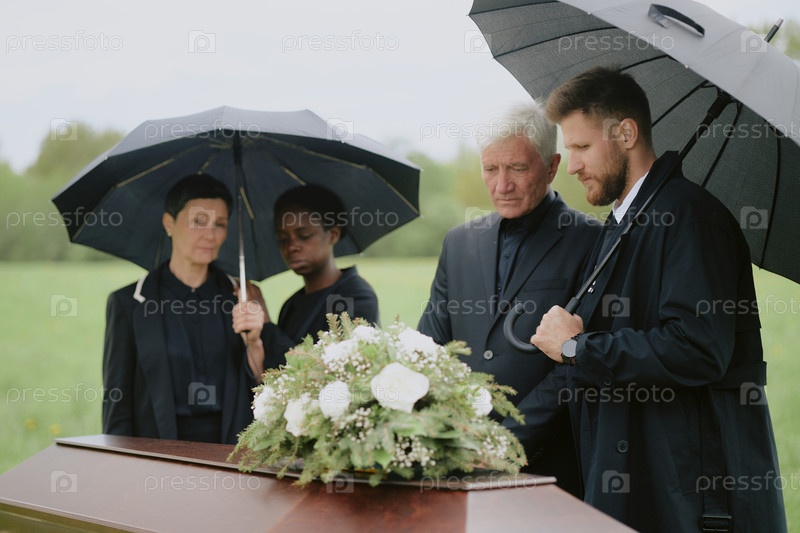 Разнообразная группа взрослых, скорбящих на похоронах под зонтами