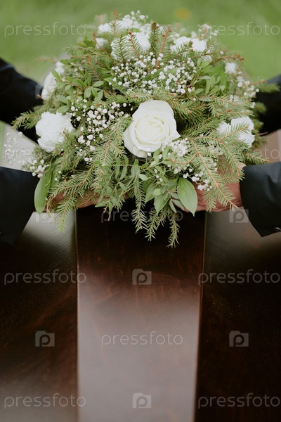 Мужские руки, несущие гроб с розами во время похоронной церемонии