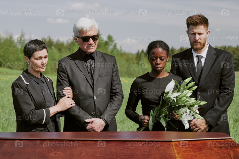 Различная группа взрослых, скорбящих рядом с гробом во время церемонии похорон на открытом воздухе