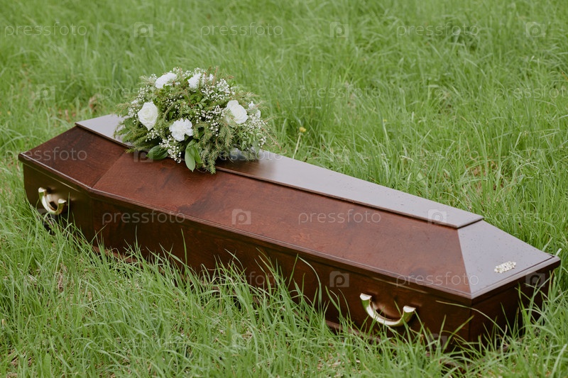 Деревянный гроб с цветочным расположением, отдыхающий на траве во время похоронной церемонии