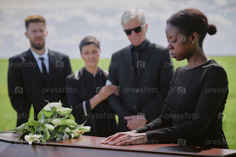Молодая чернокожая женщина скорбит рядом с гробом во время похоронной церемонии на открытом воздухе