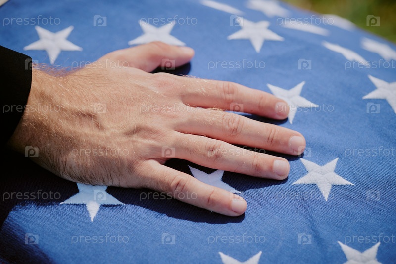 Мужчина среднего возраста кладет руку на американский флаг во время похоронной церемонии
