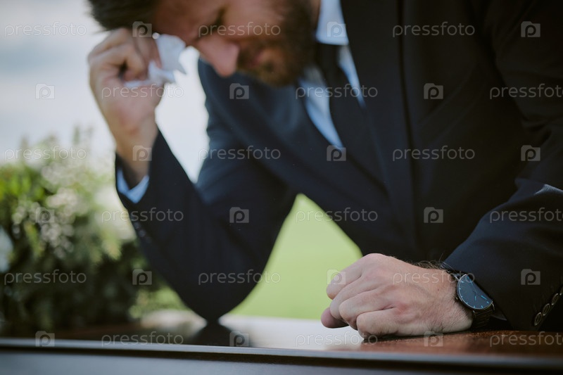 Молодой взрослый мужчина скорбит рядом с гробом во время похоронной церемонии
