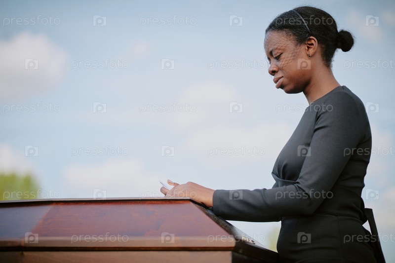 Молодая взрослая чернокожая женщина скорбит рядом с гробом во время похоронной службы на открытом воздухе
