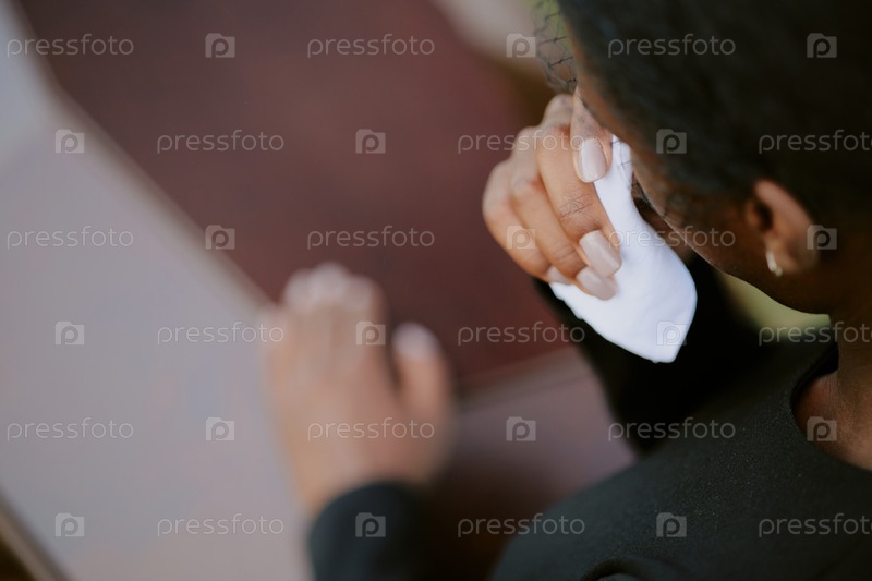 Молодая взрослая чернокожая женщина скорбит рядом с гробом во время похоронной церемонии