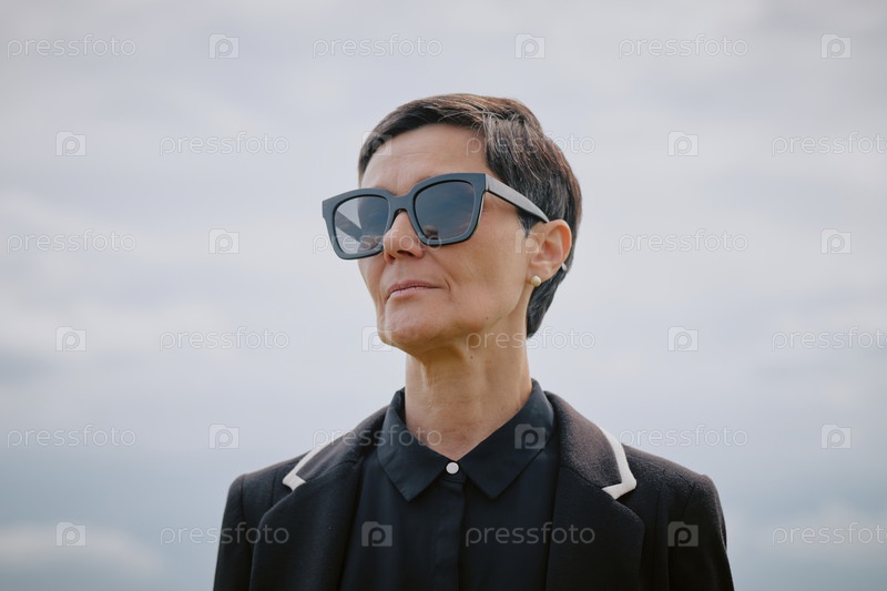 Женщина среднего возраста стоит на улице, посещая похоронную церемонию