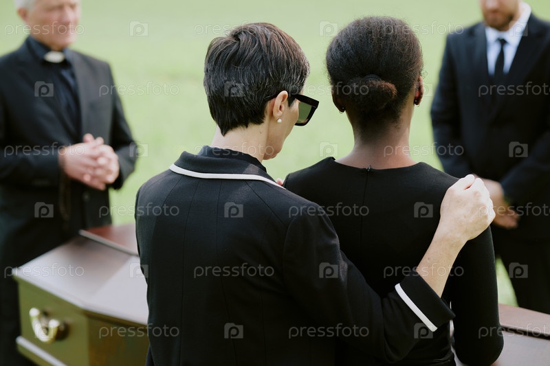 Женщина среднего возраста утешает молодую чернокожую женщину во время похоронной службы