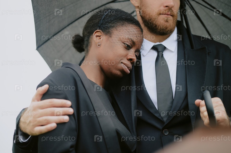 Молодая взрослая чернокожая женщина опирается на мужчину, утешающего во время похорон