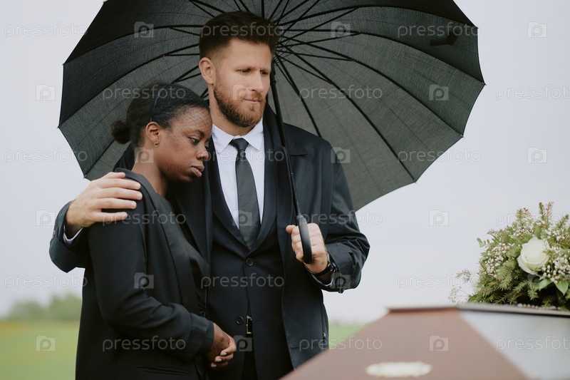 Мужчина утешает чернокожую женщину, пока скорбит на похоронах
