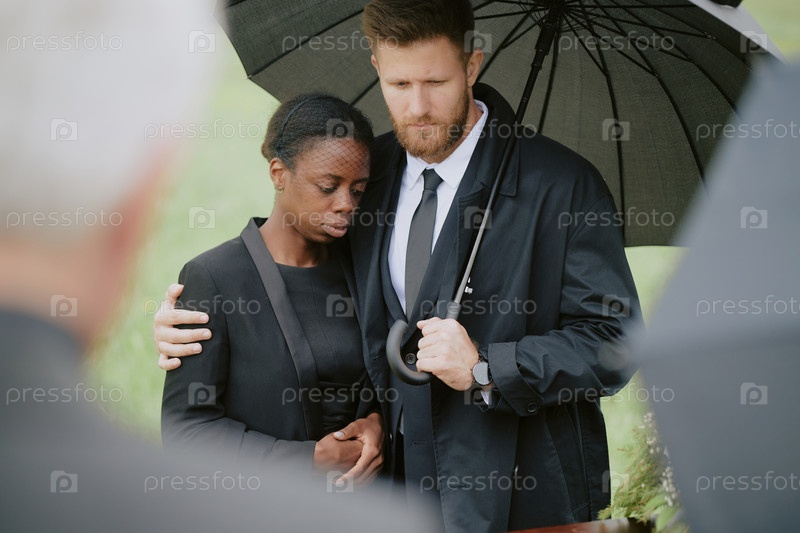 Мужчина утешает чернокожую женщину, посещая похороны на открытом воздухе