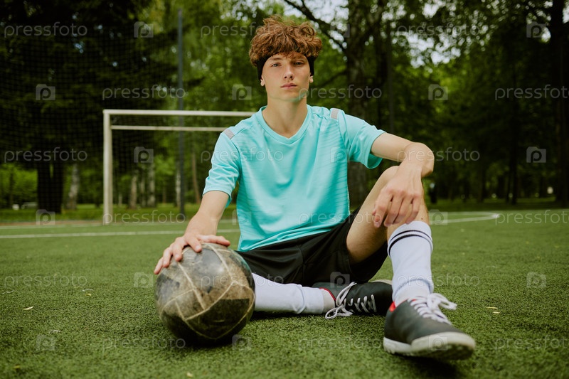 Портрет мальчика-подростка, сидящего на футбольном поле и держащего мяч