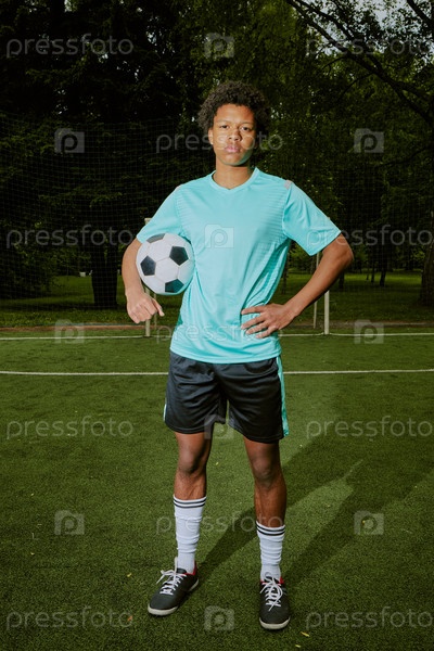 Портрет подростка, стоящего на футбольном поле и держащего мяч наружу