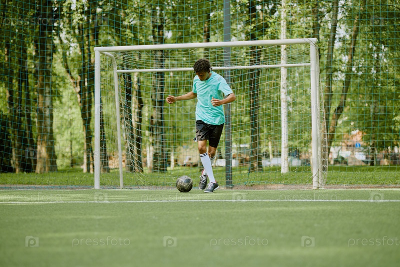 Мальчик-подросток практикует футбольные навыки на открытом футбольном поле