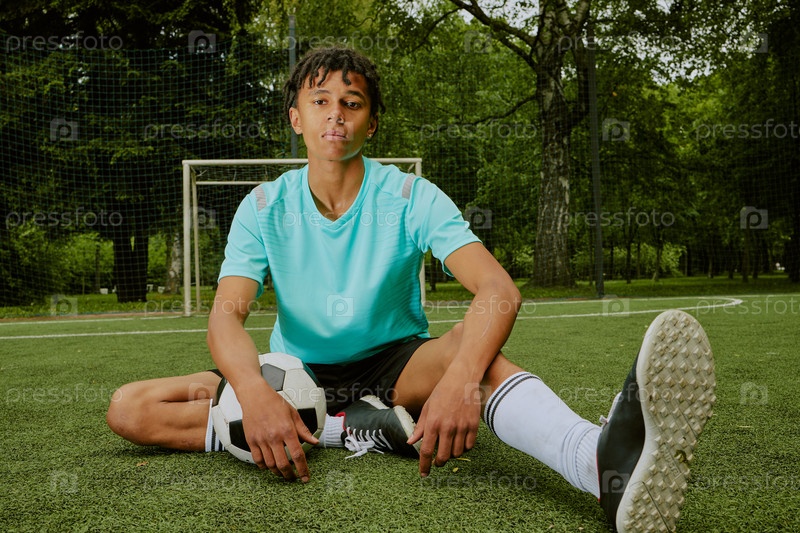 Подросток сидит на футбольном поле, отдыхая после игры в футбол