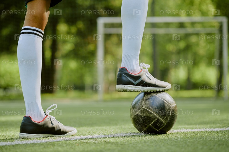 Мальчик, стоящий на футбольном поле Балансирующий ногу с мячом в открытом воздухе